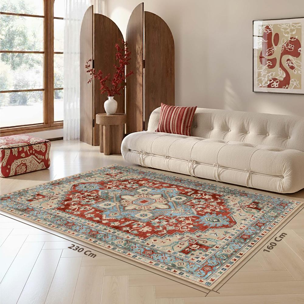 لوحة ألوان دافئة ومنعشة: مزيج فريد من الأحمر الصدئ الدافئ والأزرق السماوي البارد، مما يخلق توازناً لونياً جذاباً وحيوياً.