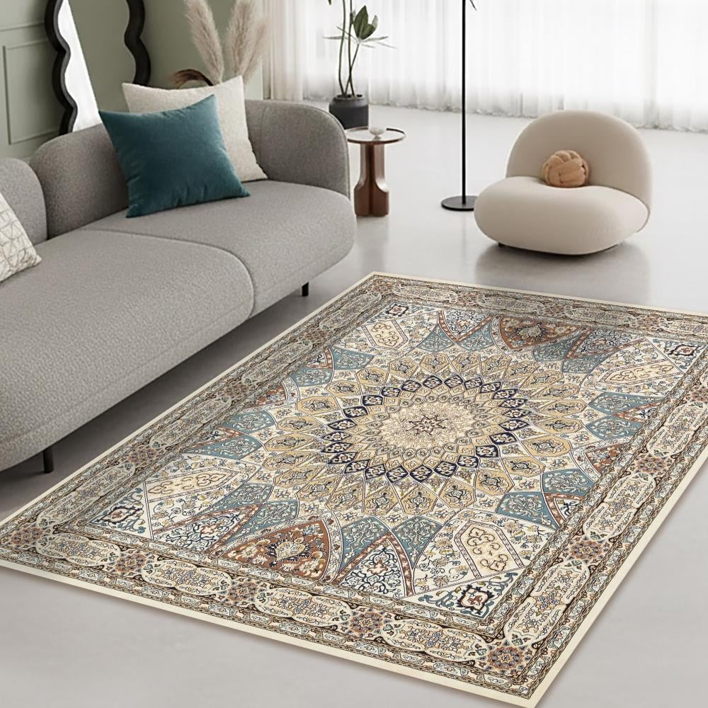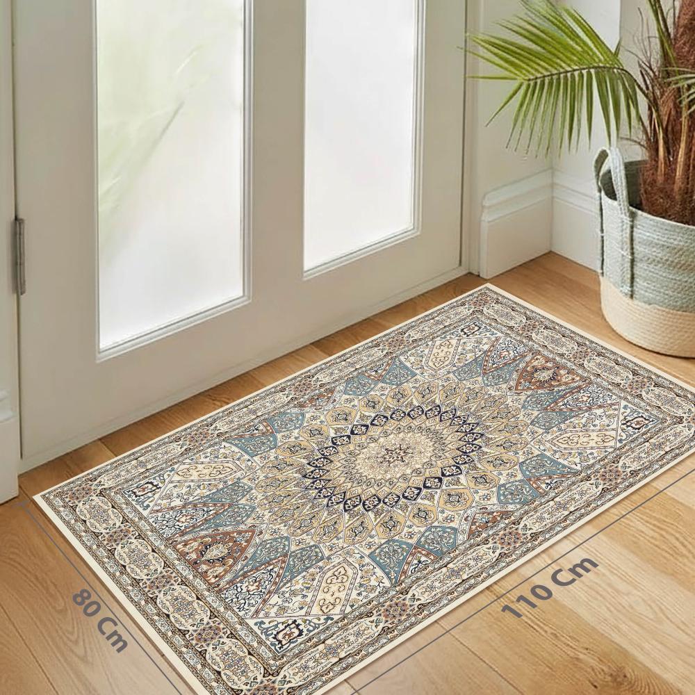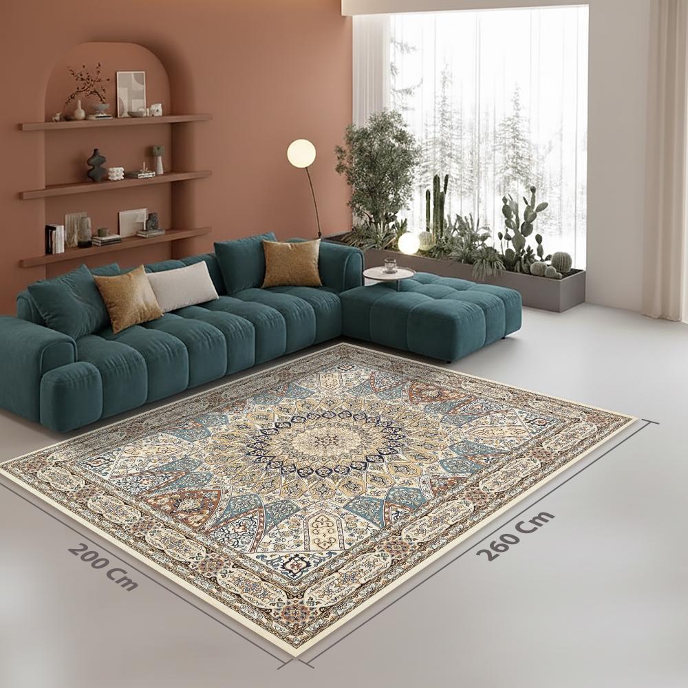 تصميم فارسي كلاسيكي راقٍ: نمط زهري ومنحني متقن، يتميز بميدالية مركزية نجمية الشكل تضفي لمسة ملكية وفخمة على غرفة المعيشة أو الصالون.