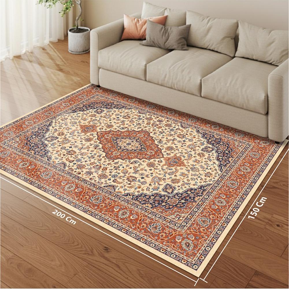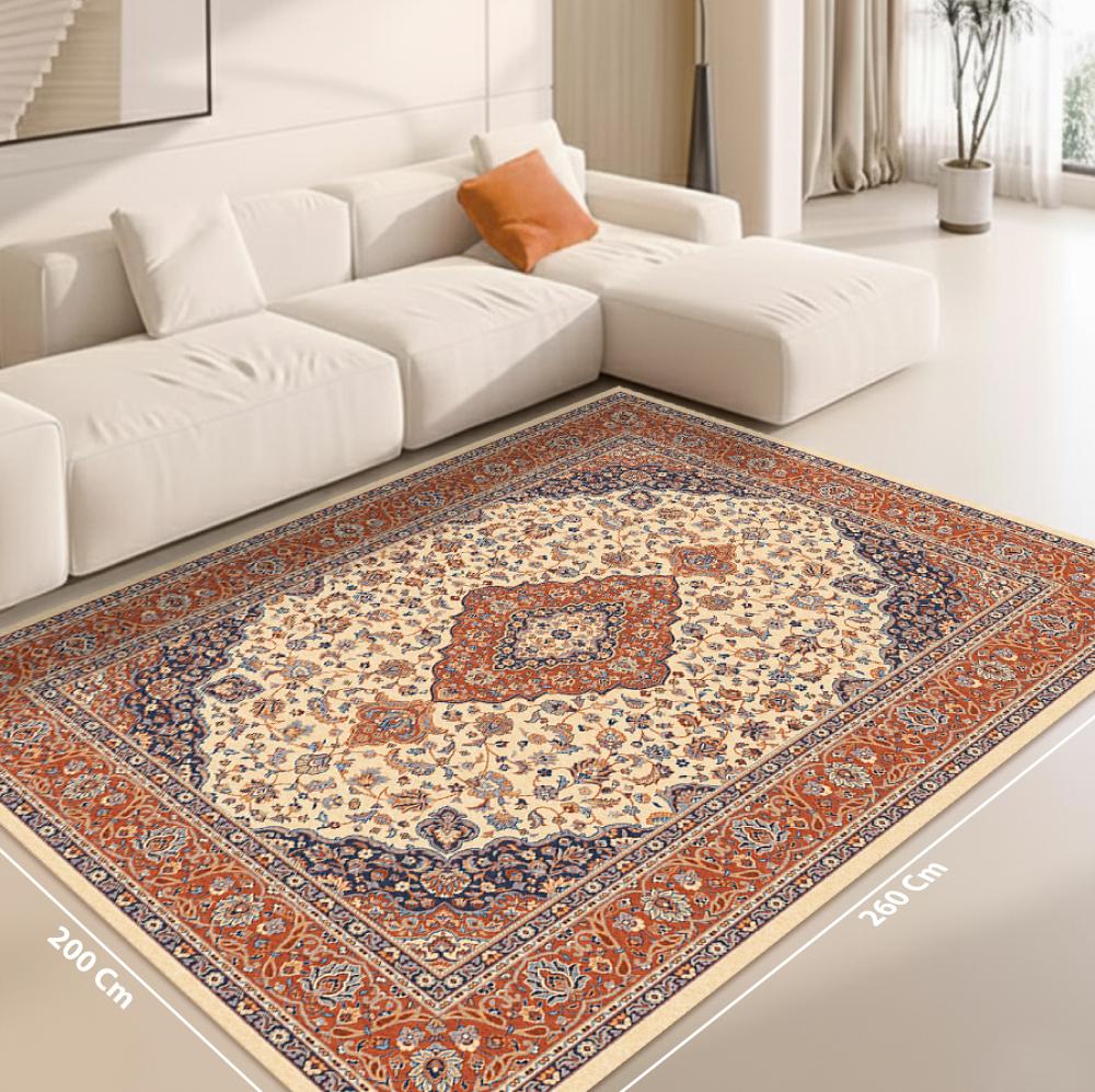 Balanced Earthy Tones: Featuring a warm, earthy color palette that infuses the room with warmth, dominated by rich rusty red and navy blue, which define intricate geometric shapes. Interspersed with touches of pale beige and olive green, it easily blends with wooden furniture and neutral-colored furnishings.